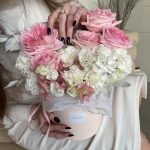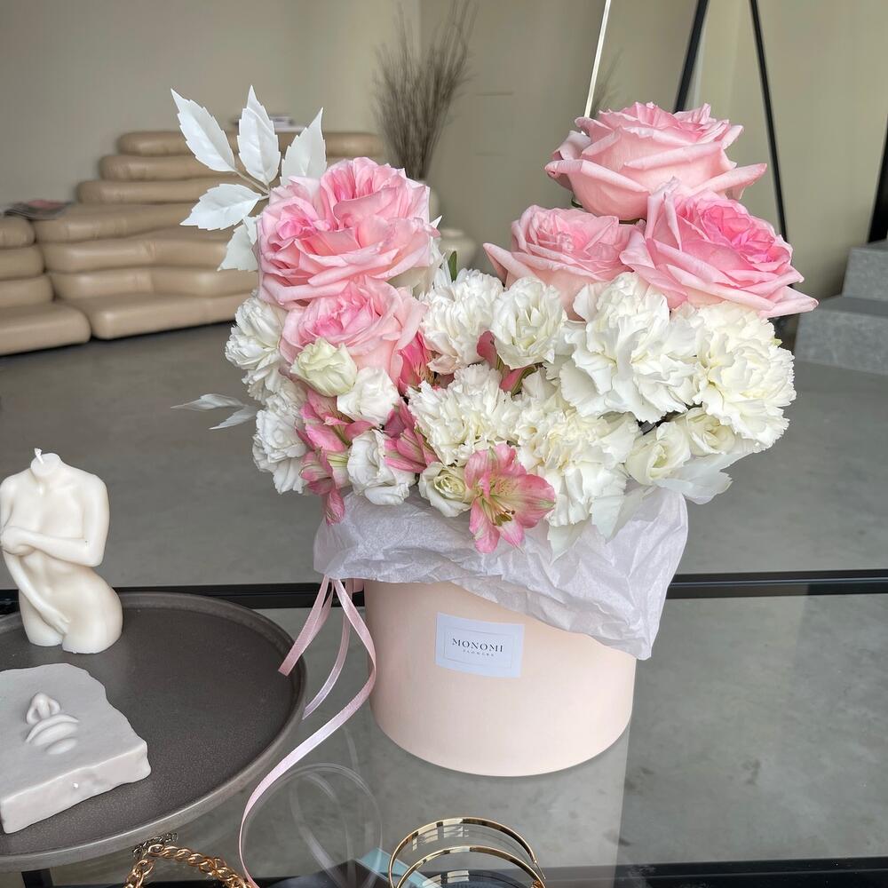 Альстромерия – 2 шт.Хризантема кустовая – 1 шт.Эустома – 2 шт.Лента атласная – 1 шт.Диантус – 8 шт.Фисташка – 5 шт.Шляпная коробка – 1 шт.Оазис флористический – 1 шт.ветки декоративные – 2 шт.наклейка фирменная – 1 шт.роза пинк охара(ароматная) – 5 шт.