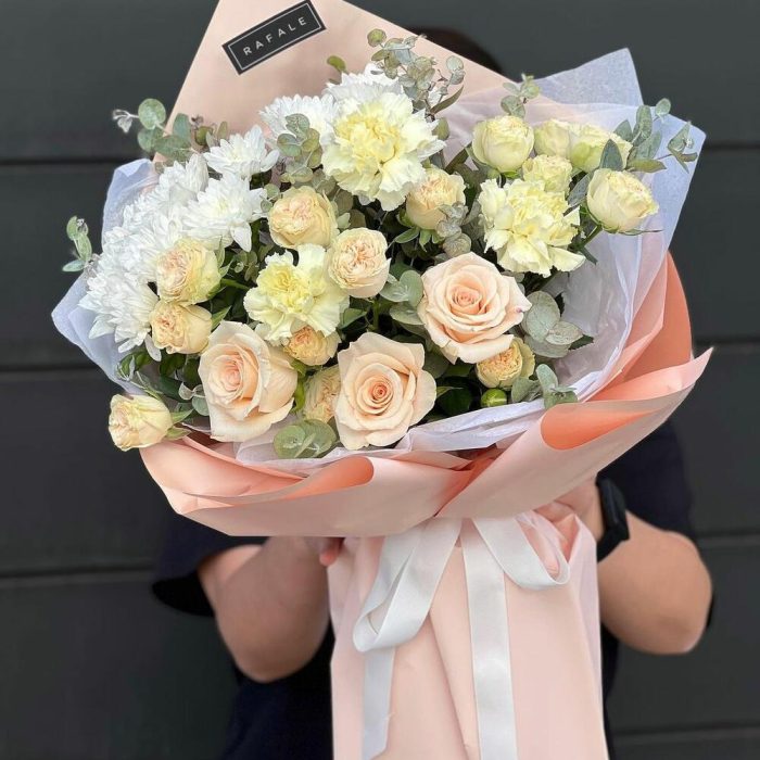 Категорий: Гвоздики, Диантус, Кенийские розы, Розы, Хризантемы, Хризантемы кустовые, Эвкалипт
