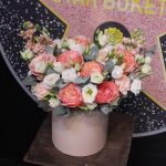 Роза пионовидная кахала – 7 шт.Маттиола – 2 шт.Эустома – 5 шт.Диантус – 3 шт.Эвкалипт – 3 шт.Оазис флористический – 1 шт.Пленка дизайнерская – 1 шт.Шляпная коробка – 1 шт.