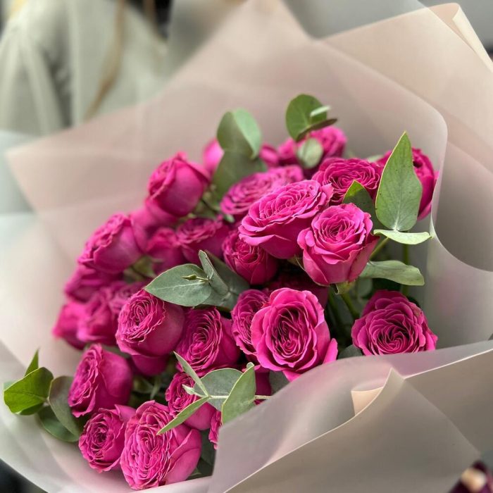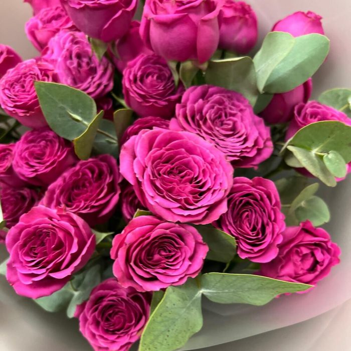 роза кустовая классик сенсейшн – 7 шт.Эвкалипт – 3 шт.Пленка матовая – 5 шт.Лента атласная – 2 шт.