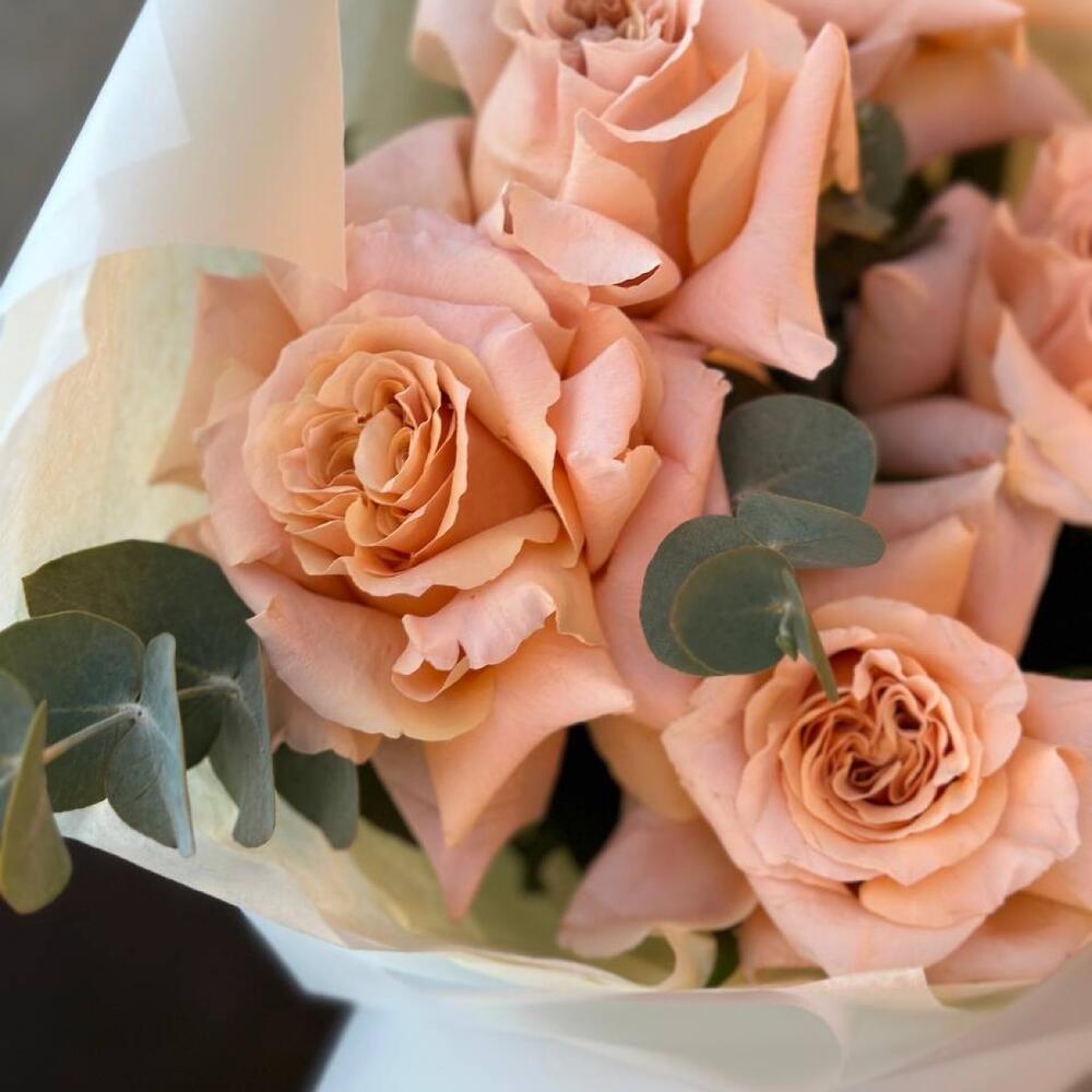 Нежные розово-персиковые розы с эвкалиптом в невесомой упаковке. Особая техника обработки делает бутон больше обычного. Стойкость таких бутонов, как у садовой пионовидной розы 3-5 дней.