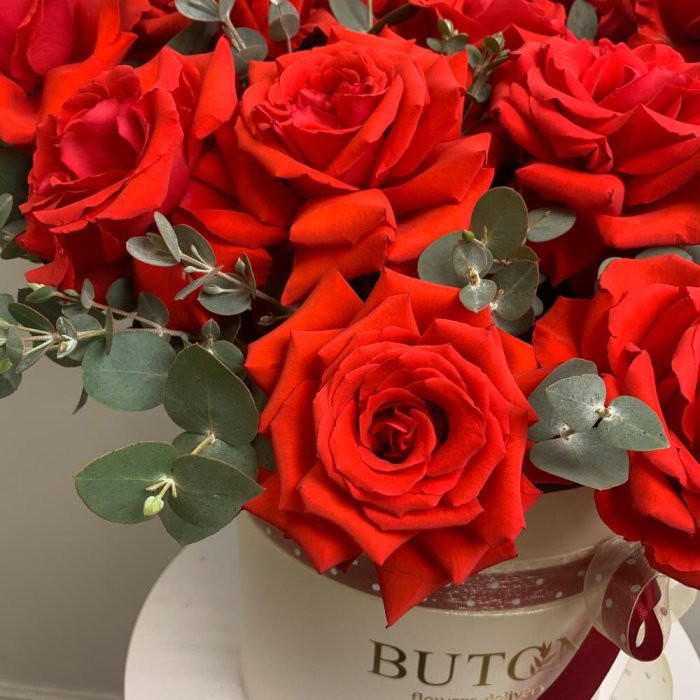 цилиндр 21*21 – 1 шт.Оазис флористический – 2 шт.Роза нина эквадор – 15 шт.Эвкалипт – 10 шт.Лента атласная – 1 шт.