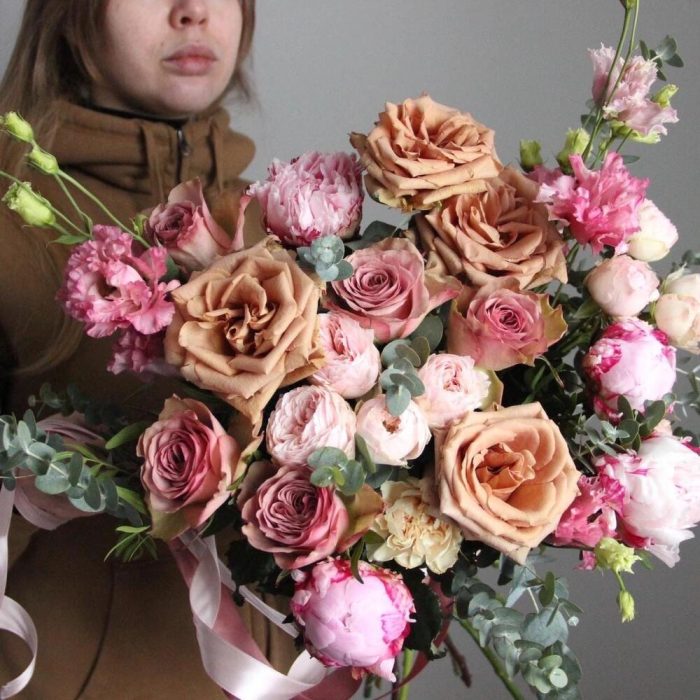 Пион – 4 шт.роза тоффи – 4 шт.Роза сортовая – 5 шт.Роза кустовая пионовидная – 2 шт.Лизиантус – 3 шт.Диантус – 3 шт.Эвкалипт – 7 шт.Лента – 1 шт.