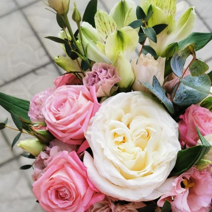 Альстромерия – 2 шт. Роза одноголовая – 1 шт. Роза кустовая пионовидная – 1 шт. зелень декоративная – 2 шт. Капучино – 1 шт.