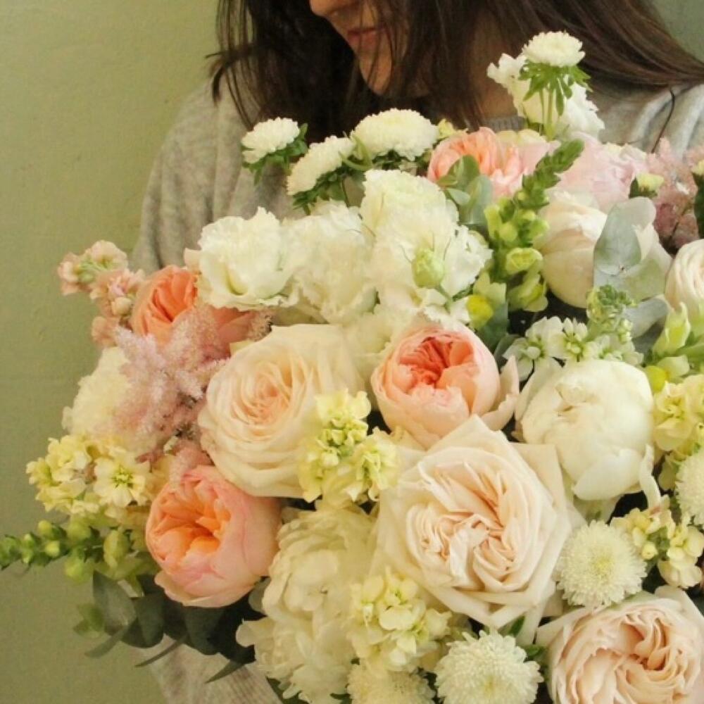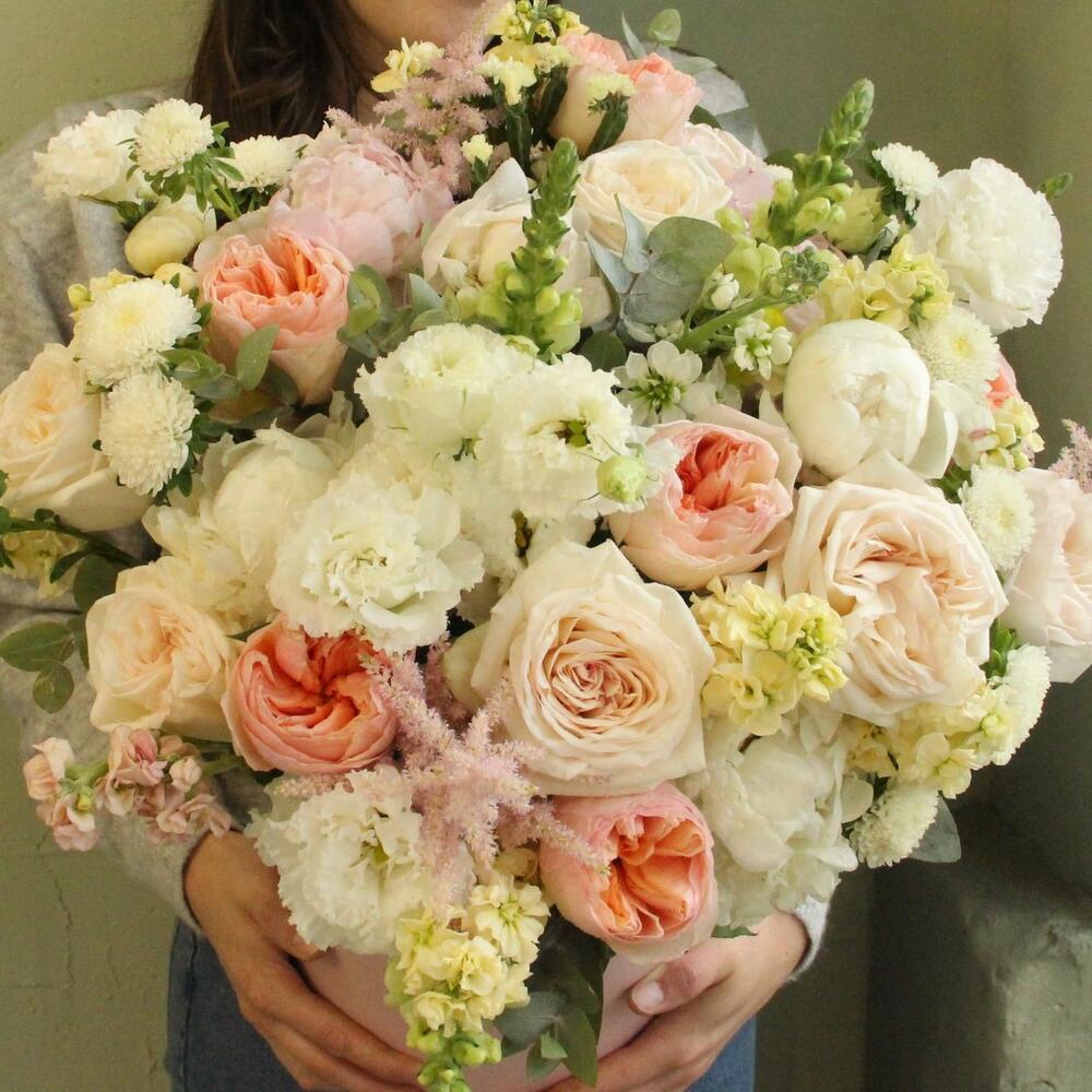 Карамельно-сливочный букет с ранункулюсами и пионовидными розами