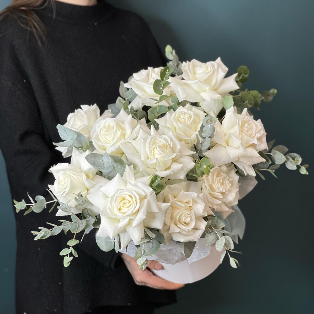 Роза – 11 шт.Эвкалипт – 4 шт.Коробка шляпная – 1 шт.Лента – 1 шт.Оазис – 1 шт.Тишью – 1 шт.