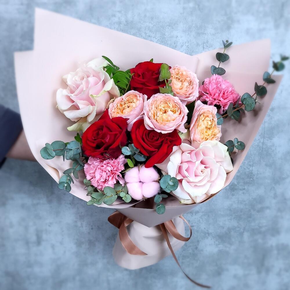 Хлопок – 1 шт.Эвкалипт – 1 шт.Роза Эквадор – 2 шт.Гвоздика – 2 шт.Роза кустовая пионовидная – 1 шт.