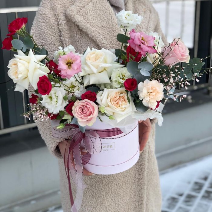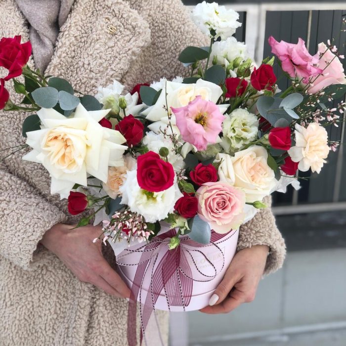 Роза одноголовая – 7 шт. Гвоздика сортовая – 3 шт. Гениста – 2 шт. Кустовая роза – 2 шт. Эустома – 3 шт. Коробка – 1 шт. Оазис – 3 шт. Эвкалипт – 2 шт.