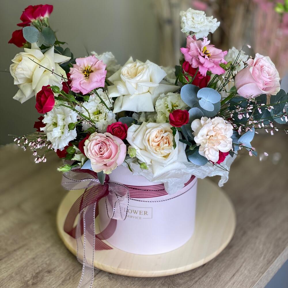 Коробка из кустовых и одноголосых ро, эустомы, эвкалипта, генисты и диантуса!