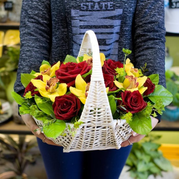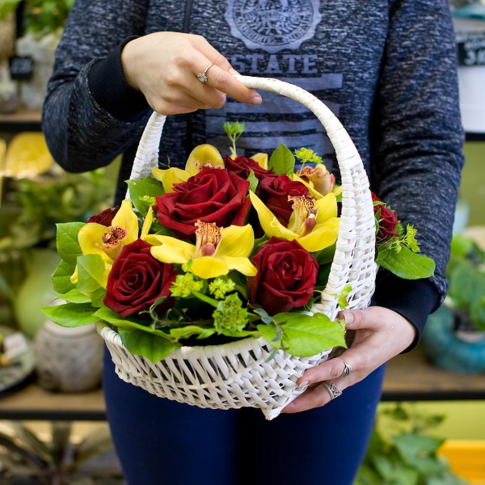 Корзина – 1 шт.Роза – 7 шт.Зелень – 1 шт.орхидея – 4 шт.