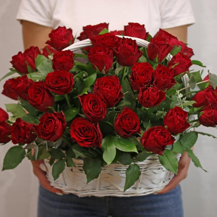 роза кения 35-40 см – 51 шт.Эвкалипт – 1 шт.Оазис – 1 шт.Корзина – 1 шт.