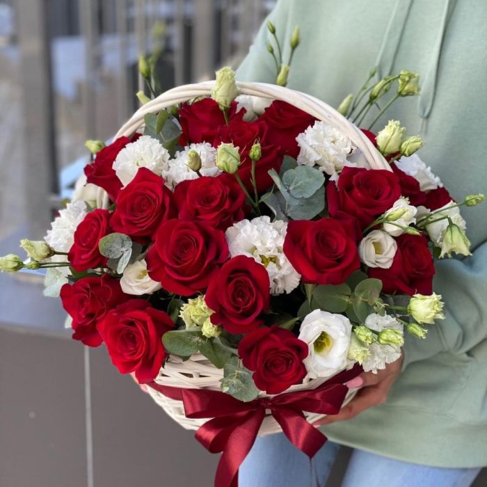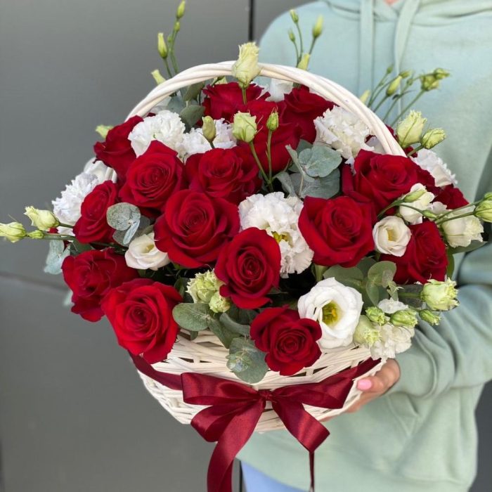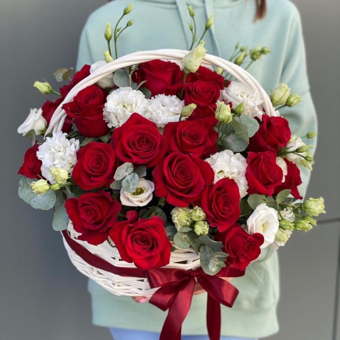 красная роза фридом – 29 шт. Эустома – 6 шт. Эвкалипт – 3 шт. Оазис – 4 шт. Оформление – 1 шт. Корзина – 1 шт.