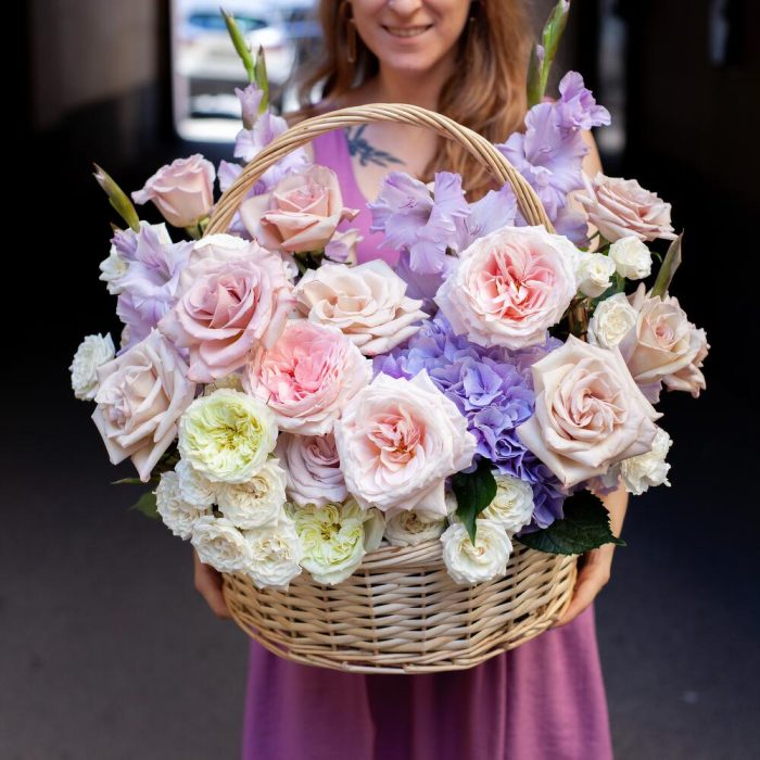 Роза пионовидная – 6 шт.Роза – 8 шт.Диантус – 9 шт.Гортензия – 1 шт.Гладиолус – 4 шт.Роза кустовая – 4 шт.Лизиантус – 3 шт.зелень микс – 3 шт.цветы микс – 4 шт.Корзина – 1 шт.