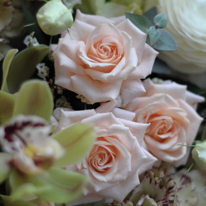 Кустовая роза – 5 шт.Ранункулюс (белый) – 4 шт.Орхидея Цимбидиум – 2 шт.Гвоздика – 3 шт.Эвкалипт – 3 шт.Сезонные цветы – 5 шт.сезонные ветки – 3 шт.Корзина – 1 шт.Флористическая губка – 2 шт.