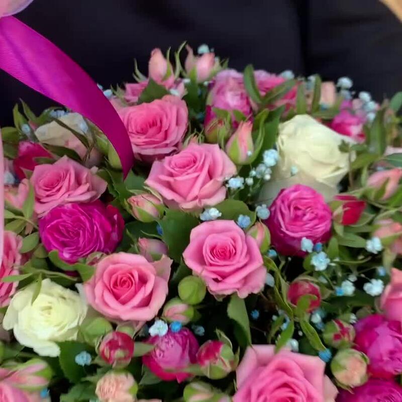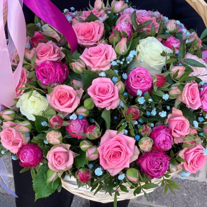 Корзина плетеная – 1 шт.Оазис флористический – 2 шт.Лента атласная – 2 шт.Фисташка – 2 шт.Роза Эквадор – 3 шт.Гипсофила – 1 шт.Роза кустовая – 5 шт.