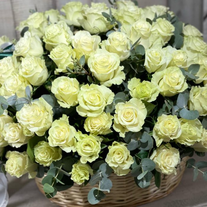 роза эквадор «мондиаль» – 101 шт.Эвкалипт – 25 шт.Оазис флористический – 5 шт.Корзина – 1 шт.Лента атласная – 4 шт.