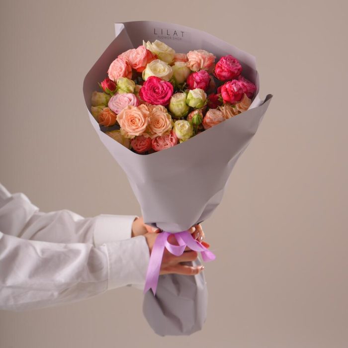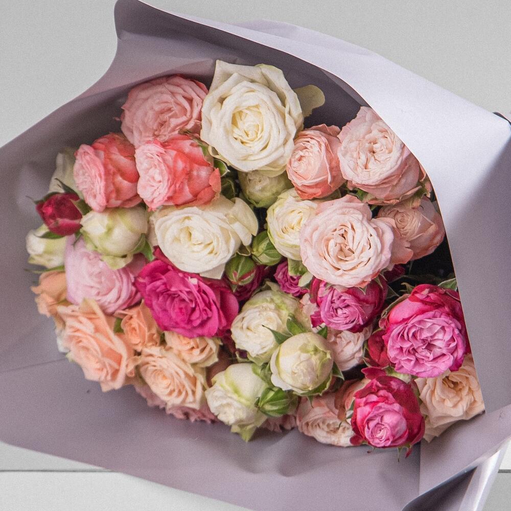 Кустовая пионовидная роза – 21 шт. Дизайнерская упаковка – 1 шт. Открыточка с вашими пожеланиями – 1 шт.