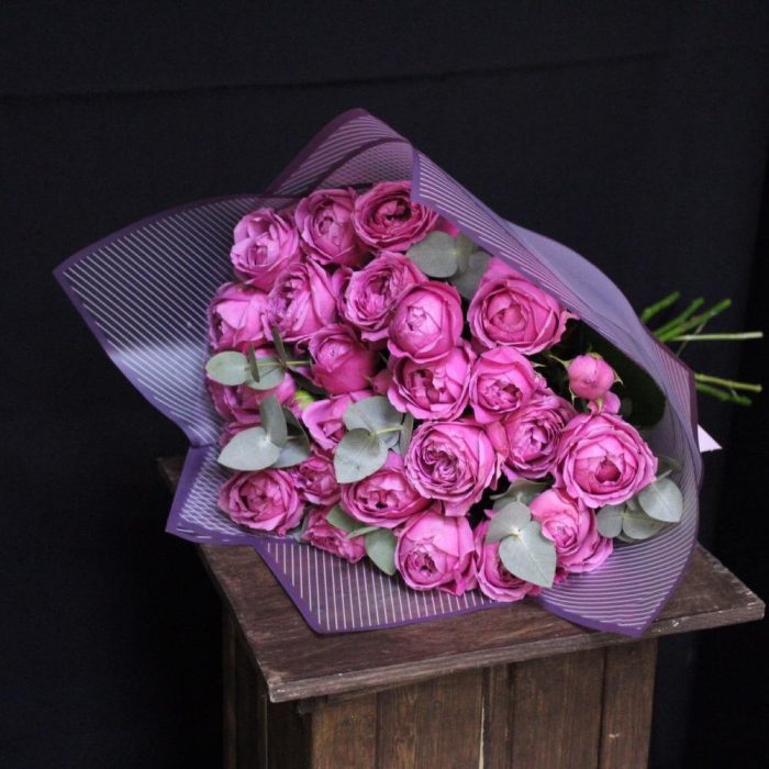 mono bouquet 52 из 9 кустовых пионовидных роз сорта Misty bubbles с эвкалиптом