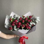 Этот яркий букет состоит из кустовых красных роз и может быть украшен зеленью и другими дополнительными элементами, чтобы придать ему более выразительный вид.