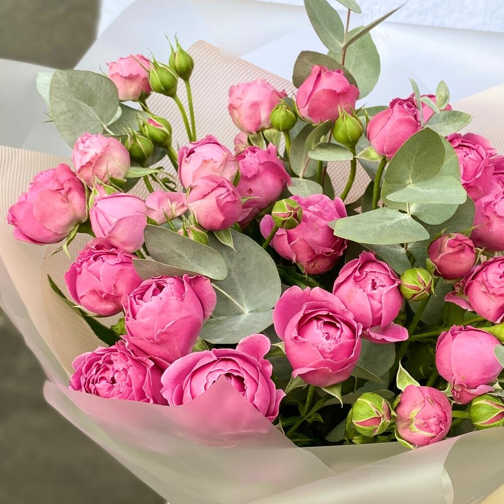Эвкалипт – 3 шт.Лента атласная – 1 шт.Упаковка дизайнерская – 2 шт.роза пионовидная кустовая мисти бабл – 7 шт.