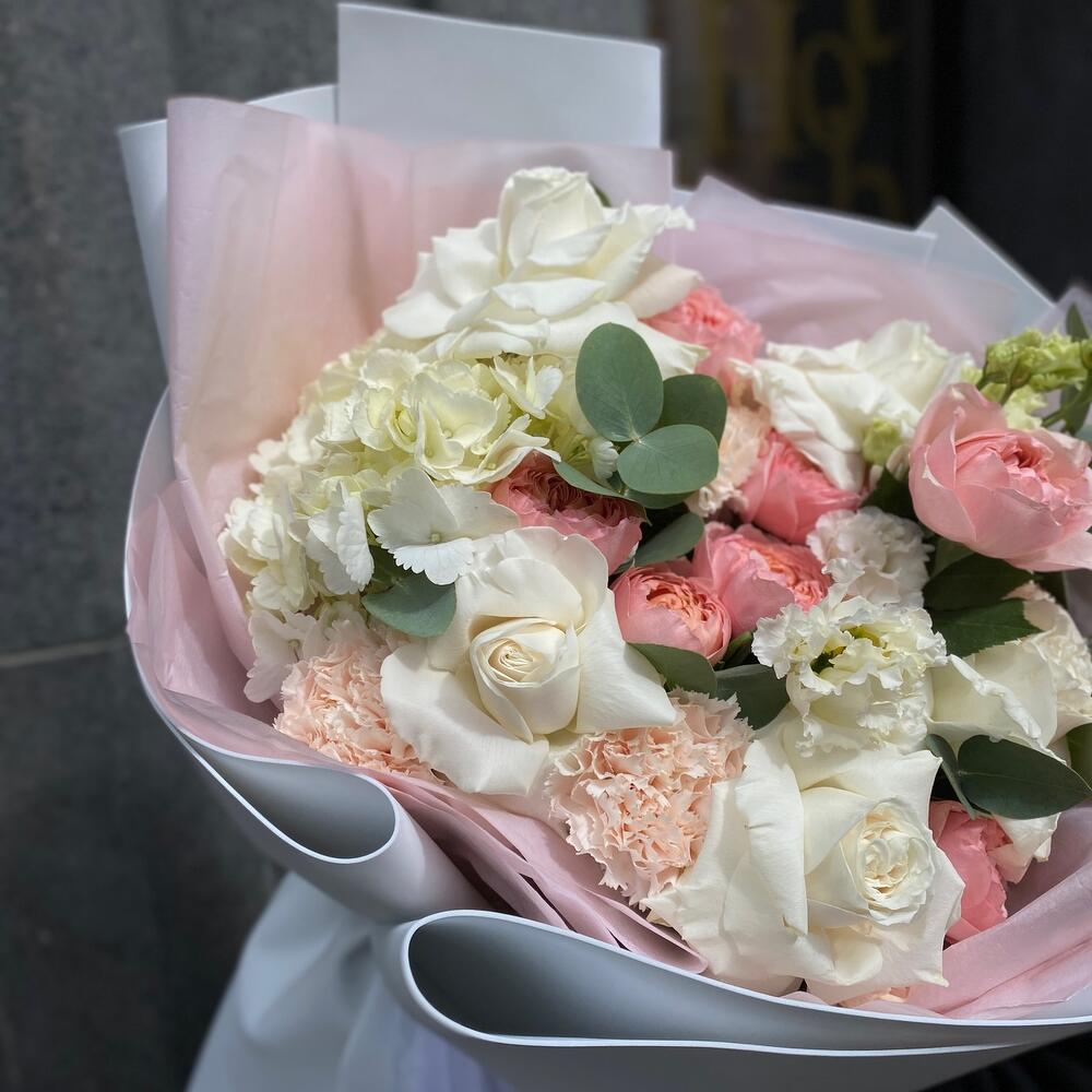 гортензия белая (колумбия) – 1 шт.Роза французская пионовидная – 5 шт.джульетта роза пионовидная – 1 шт.Диантус – 5 шт.Лизиантус Алиса белый – 1 шт.Эвкалипт цинерея – 5 шт.Пистаж – 2 шт.Тишью – 4 шт.Фоамиран (упаковка) – 4 шт.Лента атласная – 2 шт.хризал для срезанных цветов – 1 шт.инструкция по уходу за цветами – 1 шт.