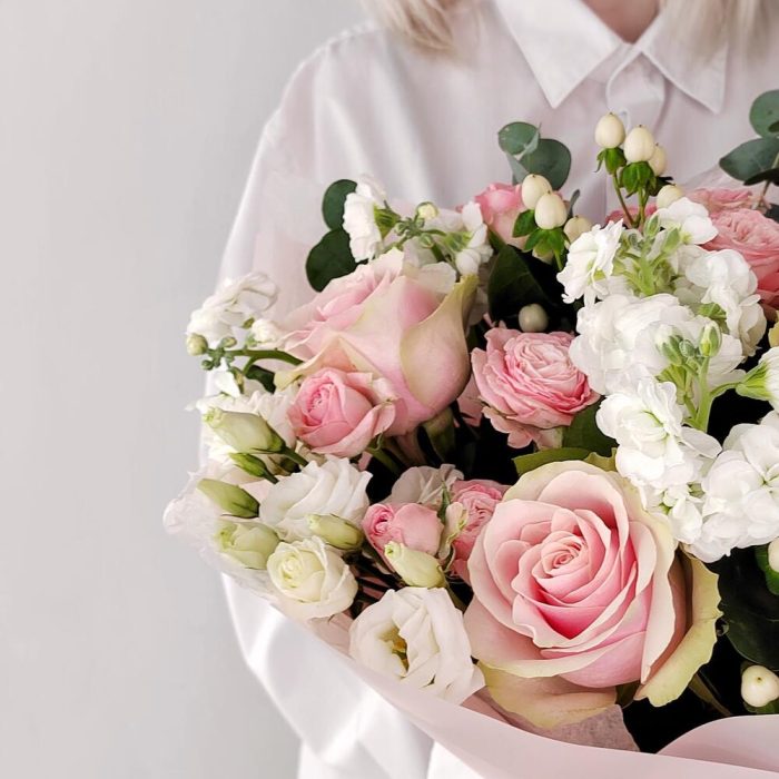 Нежный букет с розой «Бомбастик» и нежно-розовой эустомой