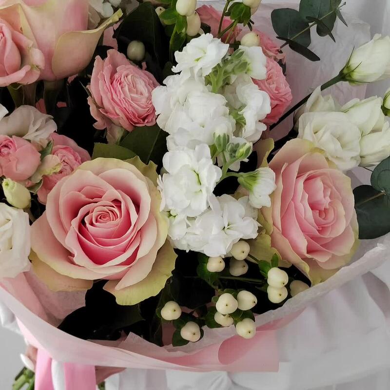 Нежный букет с розовой розой, белой эустомой и ягодами