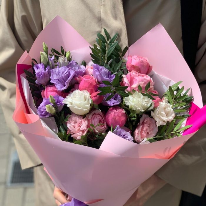 Необычный букет в нежных тонах с махровой эустомой, любимой пионовидной кустовой розой, с добавлением зелени