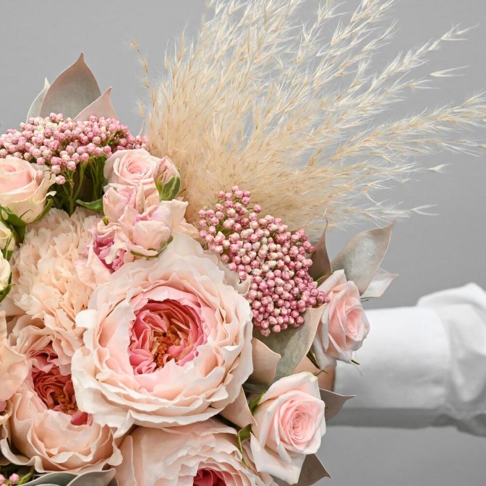 Лента – 1 шт.Маттиола – 3 шт.Озотамнус – 3 шт.Рускус – 7 шт.Кустовая роза – 3 шт.Гвоздика – 4 шт.Пионовидная роза – 3 шт.Помпасная трава – 1 шт.