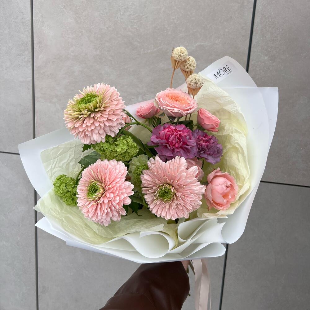 Гербера – 3 шт.Вибурнум – 1 шт.Диантус – 3 шт.Скабиоза – 1 шт.джульетта роза пионовидная – 1 шт.
