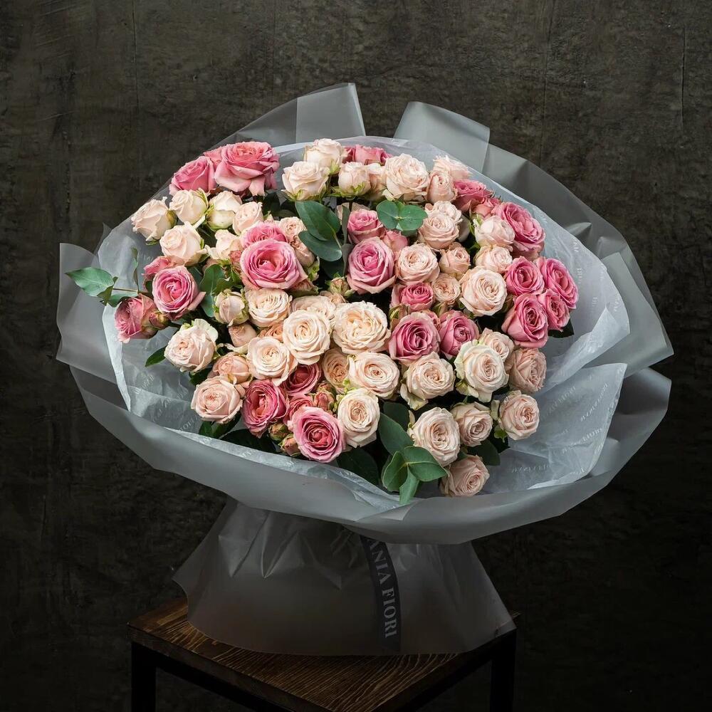 Объёмный Букет из кустовых пионовидных роз с эвкалиптом