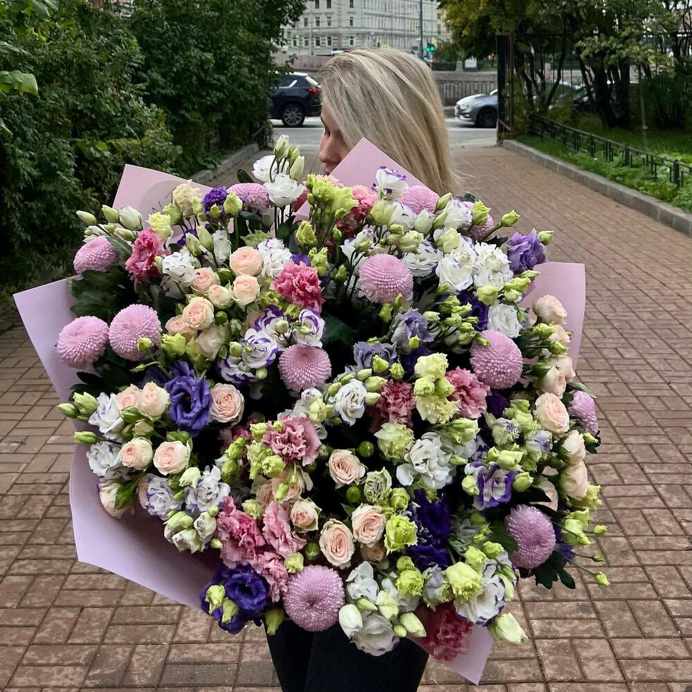 лизтантус микс – 50 шт.Кустовая роза – 9 шт.Хризантема одноголовая – 9 шт.Упаковка дизайнерская – 1 шт.Открытка – 1 шт.