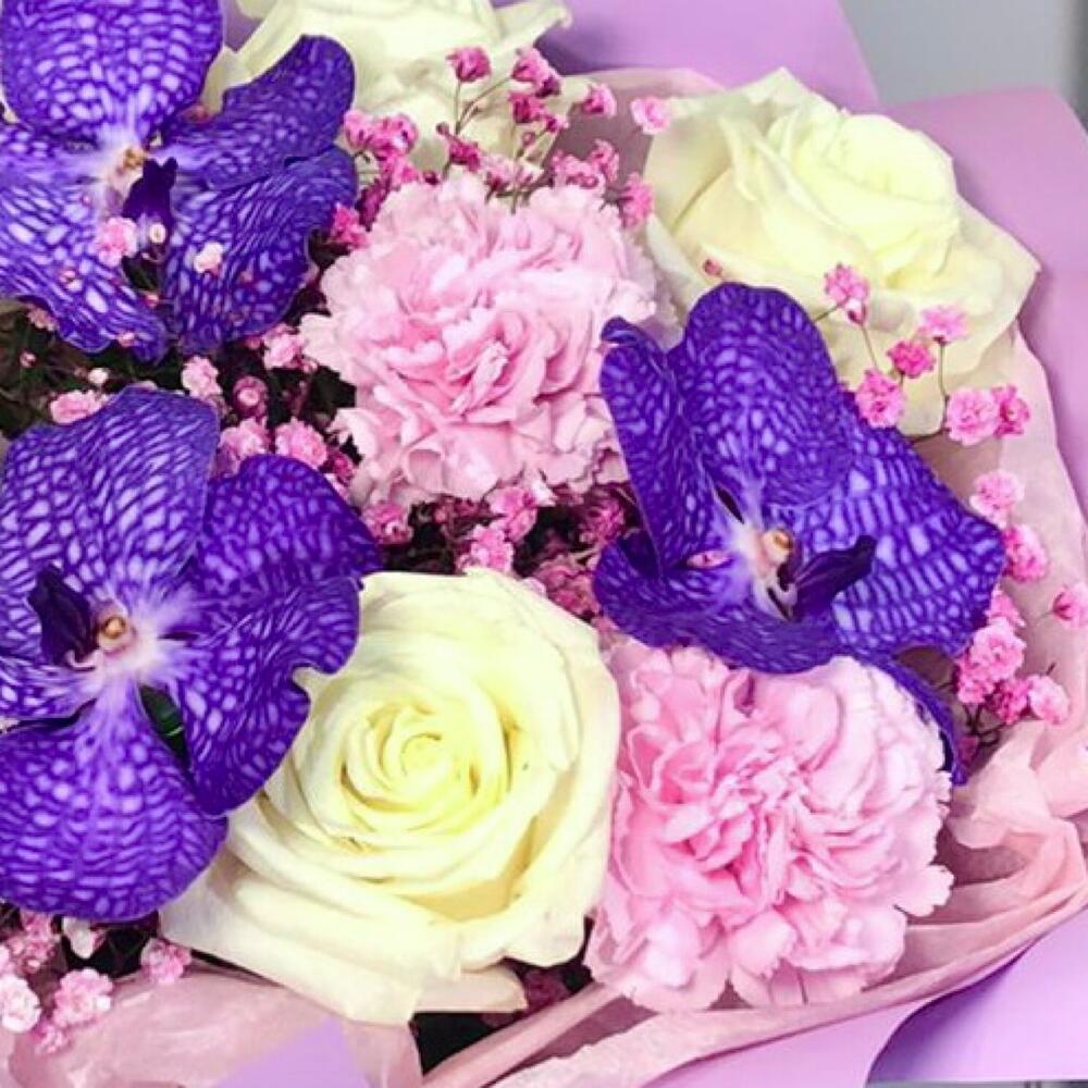 Упаковка дизайнерская – 2 шт.Лента атласная – 1 шт.Орхидея Ванда – 3 шт.Роза Эквадор – 5 шт.Гипсофила – 1 шт.Гвоздика – 3 шт.Фисташка – 3 шт.