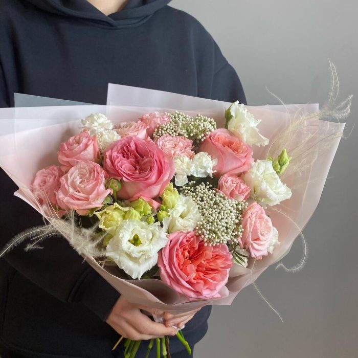 Лизиантус – 2 шт.Озотамнус – 2 шт.Гвоздика кустовая – 3 шт.Фисташка – 1 шт.Роза пионовидная – 3 шт.Роза кустовая пионовидная – 3 шт.Упаковка дизайнерская – 2 шт.Стифа – 2 шт.комплимент от polyanka – 1 шт.