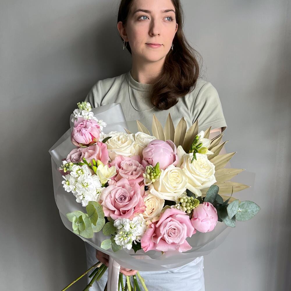пион sarah bernard – 3 шт.роза faith премиум – 4 шт.роза playa blanca премиум – 5 шт.Маттиола – 3 шт.Фрезия – 2 шт.пальма веерная сухоцвет – 1 шт.эвкалипт cineria – 2 шт.Дизайнерская упаковка – 1 шт.Лента – 1 шт.