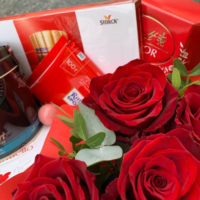 Подарочная корзина с шоколадными конфетами и композицией из роз