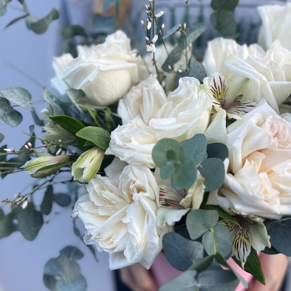Эвкалипт – 1 шт.Коробка шляпная – 1 шт.Гениста – 1 шт.Оазис флористический – 1 шт.листья фисташки пучок – 1 шт.роза white o’hara – 9 шт.