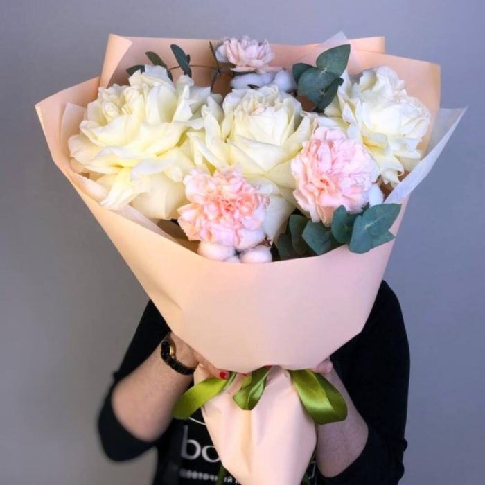 Хлопок – 3 шт.Эвкалипт – 3 шт.Гвоздика – 3 шт.Лента атласная – 1 шт.флористическая пленка – 1 шт.роза французская белая – 3 шт.подкормка для стойкости цветов – 1 шт.открытка для пожеланий – 1 шт.
