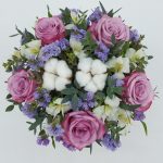 Роза одноголовая – 5 шт.Альстромерия – 3 шт.Хлопок натуральный – 2 шт.Статица лавандовая – 3 шт.Эвкалипт – 4 шт.Коробка цилиндр – 1 шт.Пленка матовая – 1 шт.Лента атласная – 1 шт.Флористическая губка (оазис) – 1 шт.