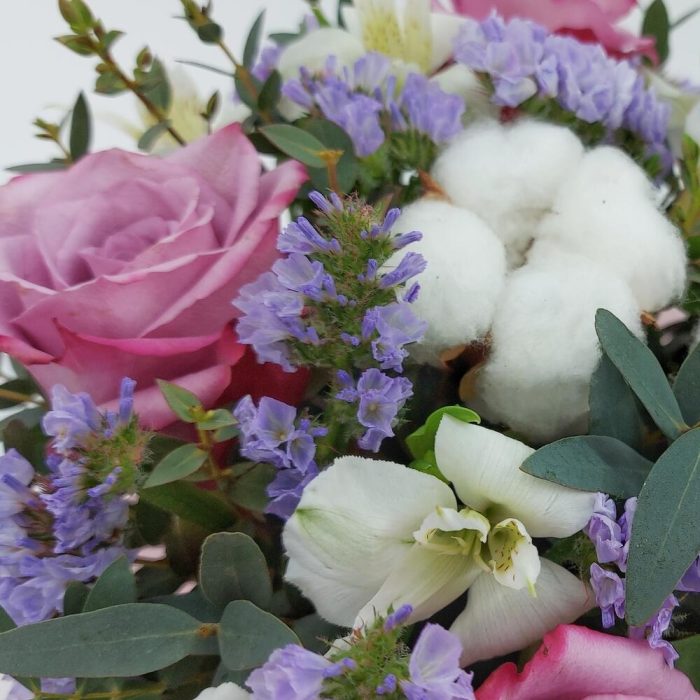 Розы, альстромерия и хлопок в коробке “Сиреневые облака”