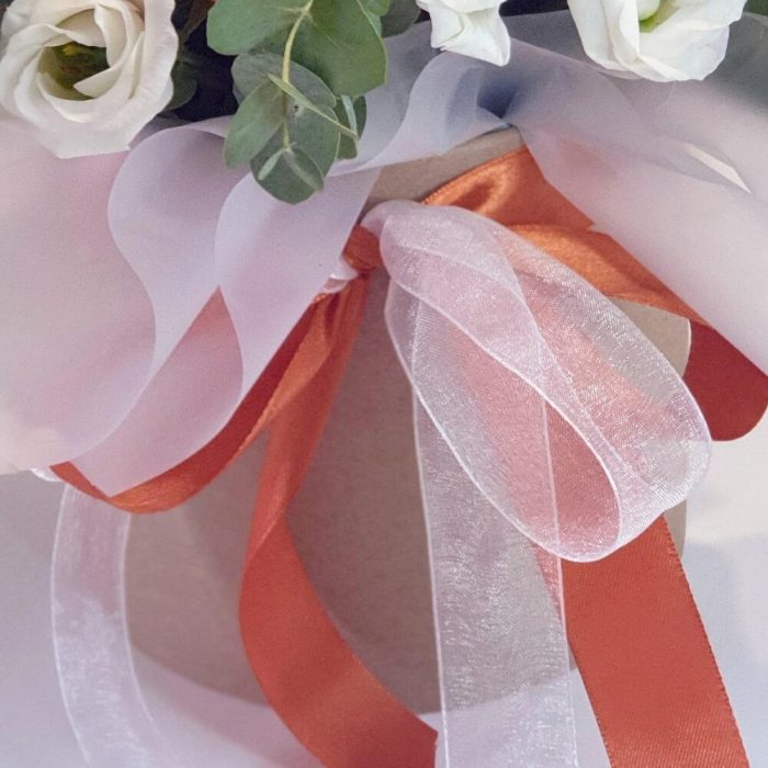 Роза Капучино – 3 шт.Эвкалипт – 3 шт.Лента атласная – 2 шт.Лизиантус белый – 5 шт.Открыточка с вашими пожеланиями – 1 шт.Оазис флористический – 1 шт.коробка шляпная крафт – 1 шт.