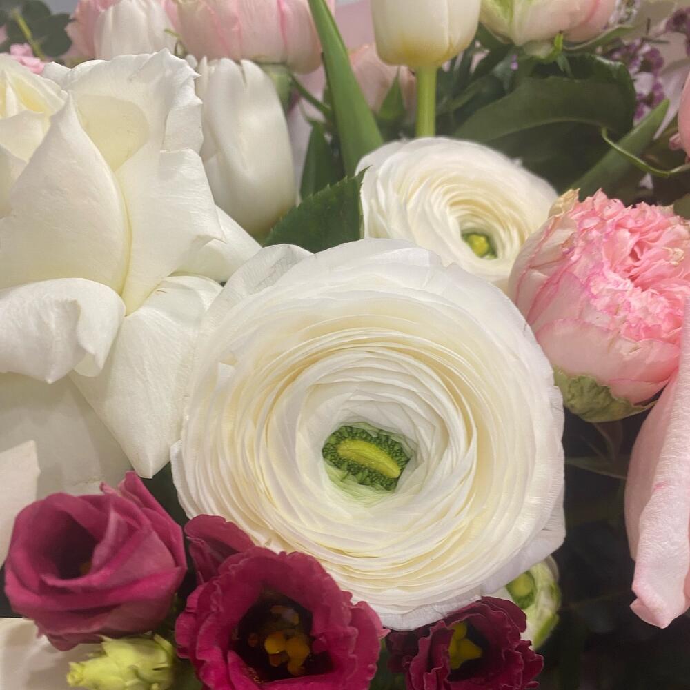 Ранункулюс – 3 шт.плая бланка роза – 3 шт.Pink O’Hara роза – 5 шт.Кустовая пионовидная роза – 2 шт.Тюльпан – 3 шт.Хамелациум – 2 шт.Эустома – 3 шт.Эвкалипт Микс – 3 шт.Упаковка дизайнерская – 5 шт.Лента атласная – 1 шт.