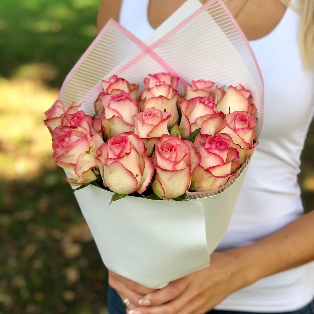 Шикарный букет из 15 роз с розовой каймой!