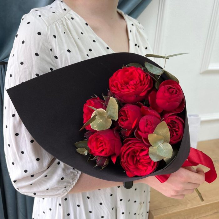 роза пионовидная ред пиана – 7 шт.Эвкалипт – 3 шт.Дизайнерская упаковка – 1 шт.Лента атласная – 1 шт.подкормка для срезанных цветов – 1 шт.рекомендация по уходу за цветами – 1 шт.