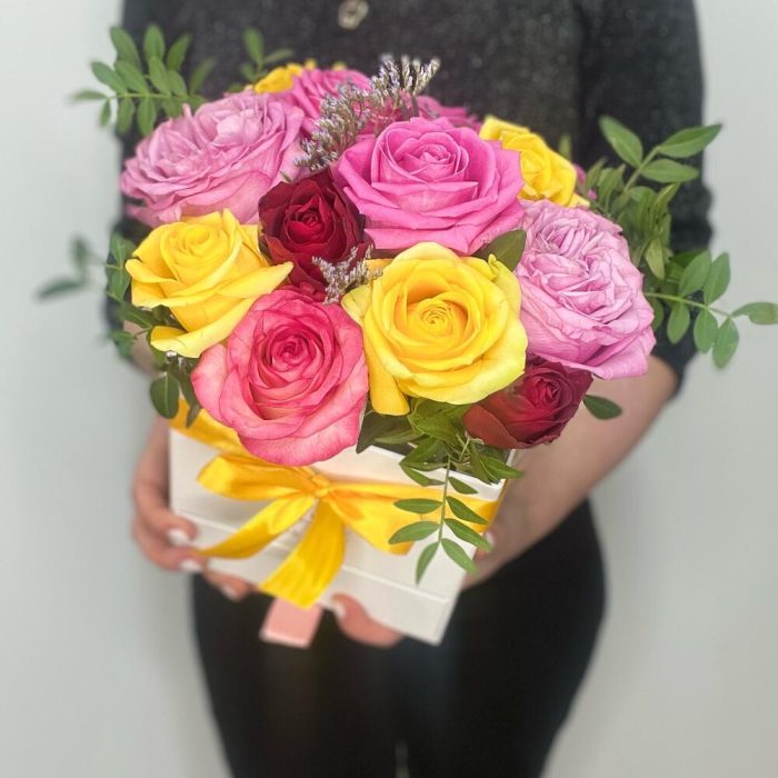 Шкатулка с розами и свежей клубникой в бельгийском шоколадеБукет который удивит получателя своей красотой и порадует необычным десертом Размер коробочки 15*15 смВысота композиции около 30 смВ выдвижном ящике клубника в белом и молочном бельгийском шоколаде с посыпками: кокосовая стружка, сублимированная малина Дополнительно упаковывается в прозрачную пленку с бантом
