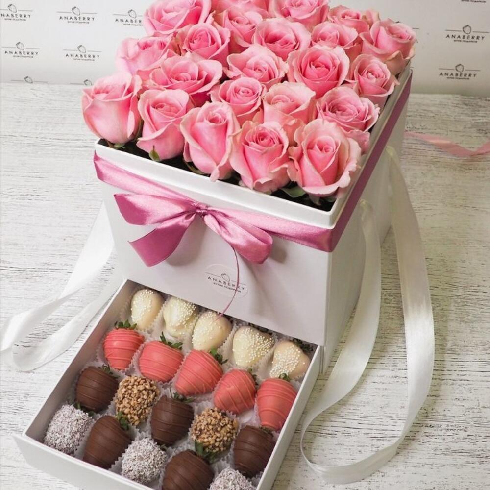 Шкатулка с розами и клубникой в шоколаде