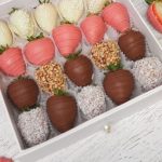 -25 розовых роз-клубника в бельгийском молочном, белом и розовом шоколаде 20 шт (кондитерские посыпки, кокосовая стружка, ореховая стружка) размер коробки 20*20*20 см