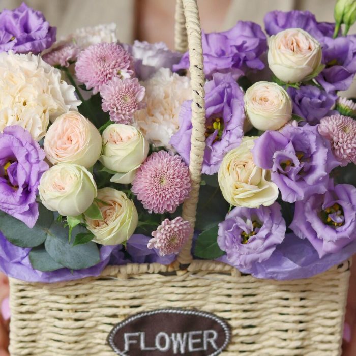 Сиреневая композиция в корзине с розами и эустомой