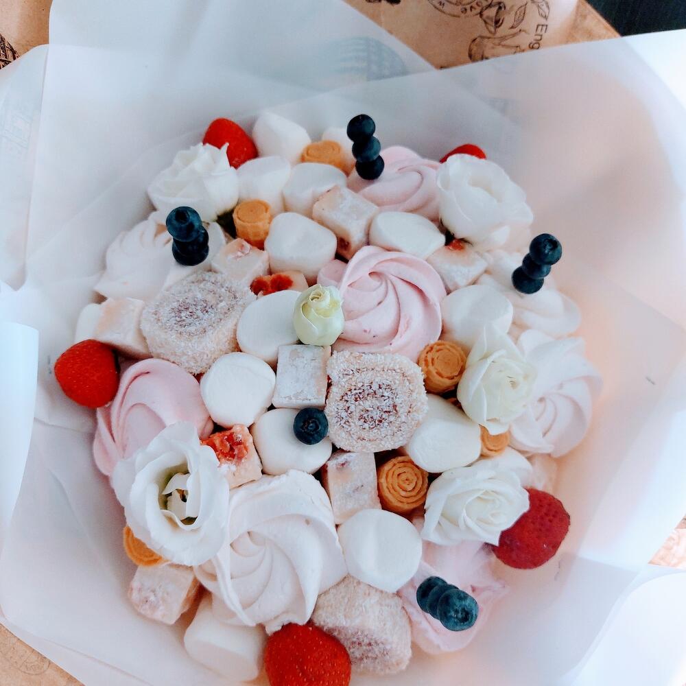 Зефир – 7 шт.рахат лукум – 200 гр.Маршмеллоу (пачка) – 1 шт.Клубника – 5 шт.вафельные трубочки – 5 шт.Голубика – 25 гр.Роза кустовая – 1 шт.Упаковка дизайнерская – 1 шт.