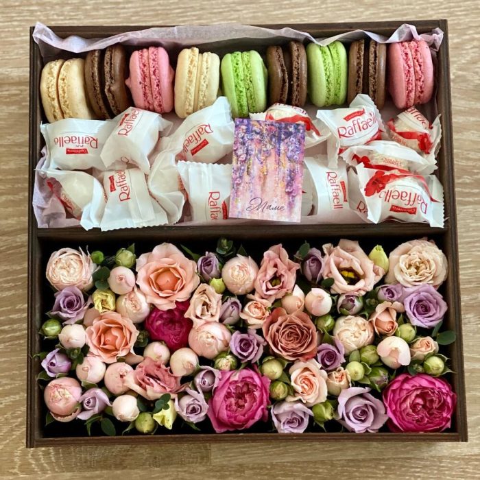 Сладости и цветы в деревянном ящике